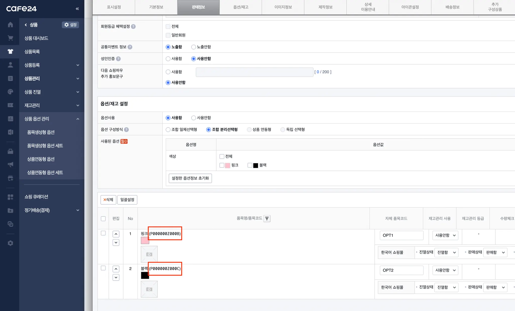 옵션이 있는 상품인 경우, 반드시 옵션정보를 설정해주세요.이때 옵션코드는 자동으로 생성됩니다.