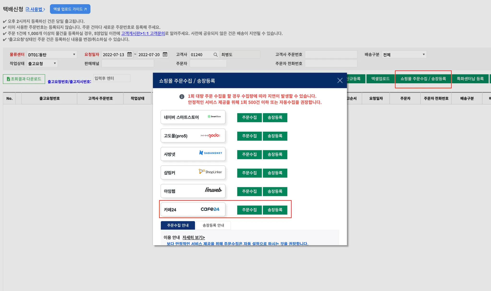 카페24에서 수집된 주문이 일정 시간마다 출고관리 > 택배신청 에 자동 등록됩니다.