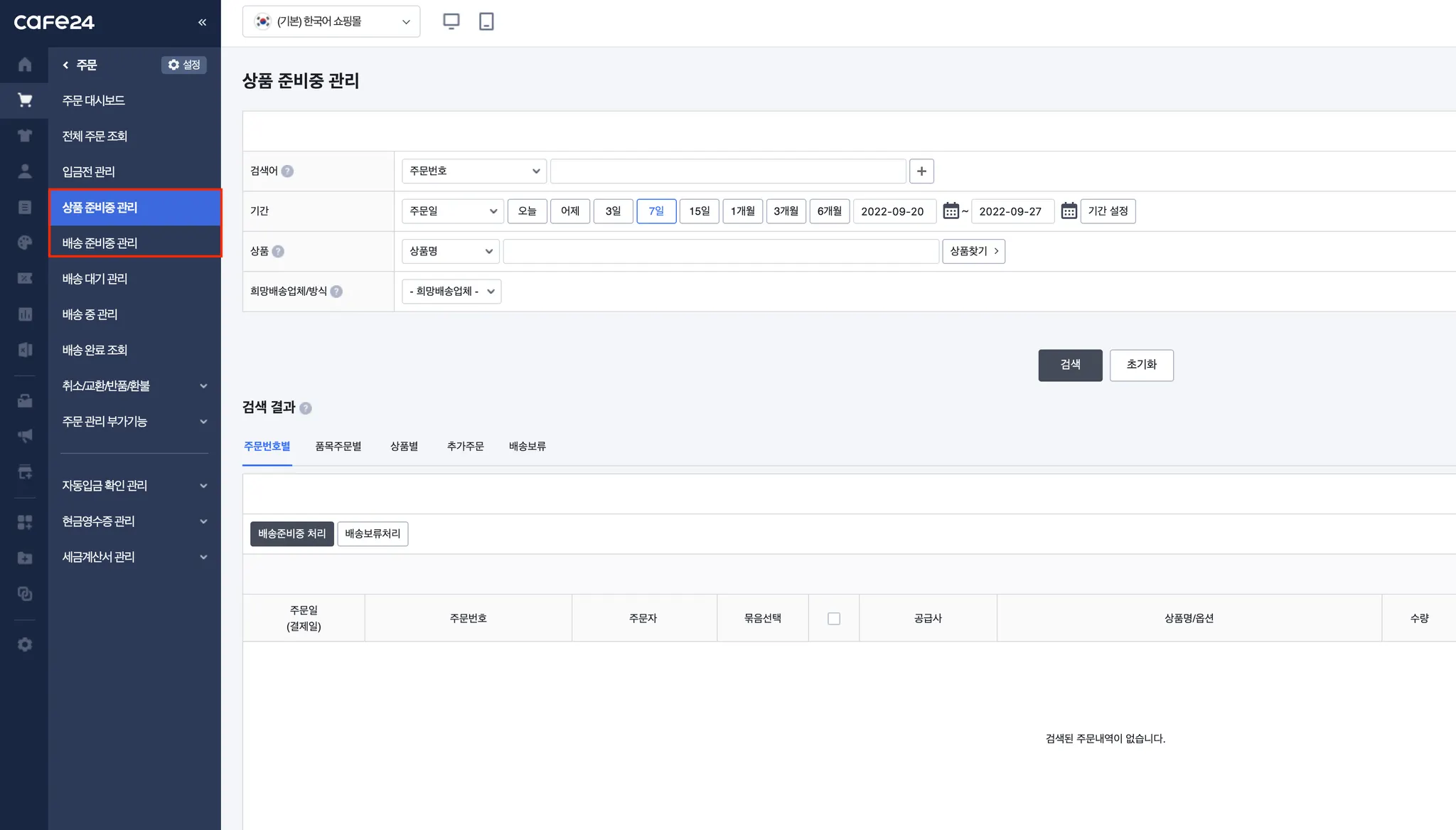 카페24 주문의 상태 중 ‘배송준비중’ 또는 ‘상품준비중(결제완료)’인 주문이 수집 대상입니다.