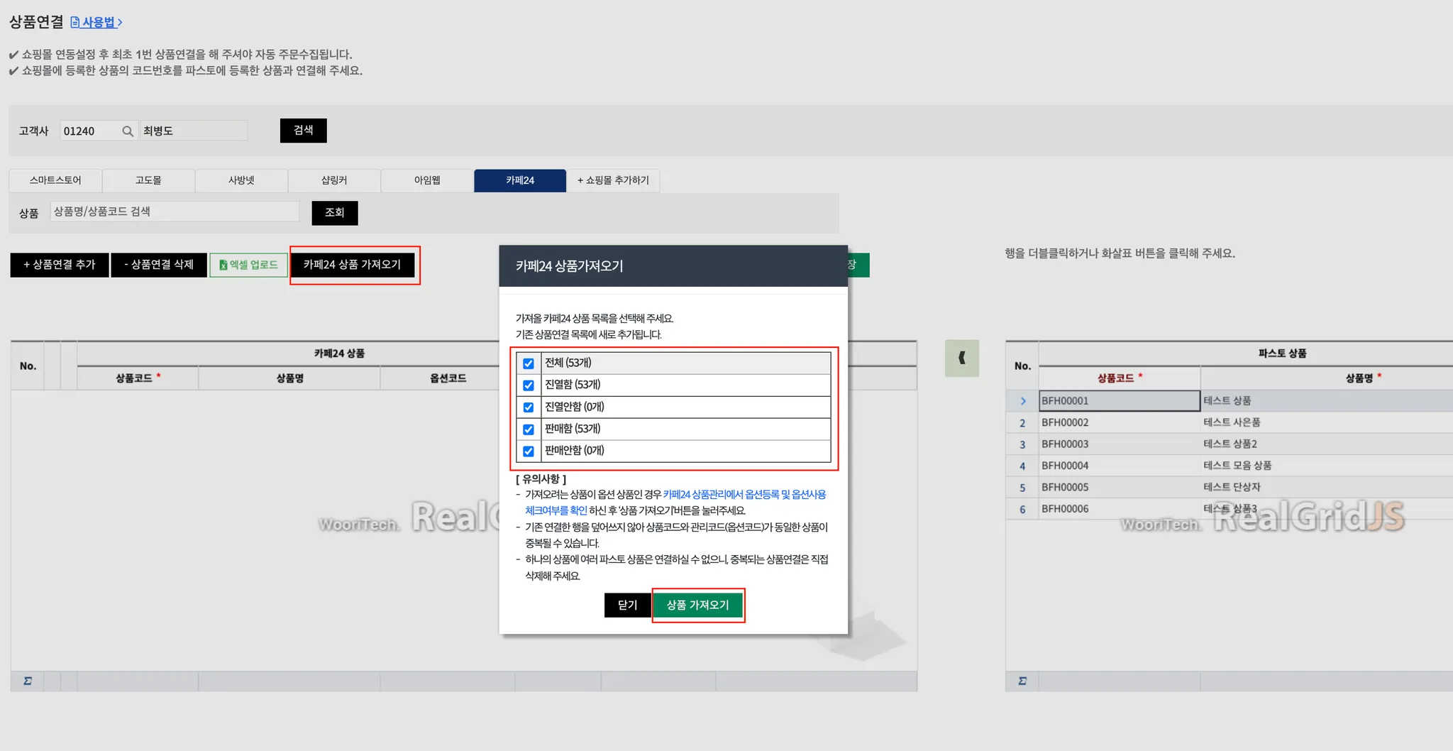 카페24에 등록한 상품을 FMS에 등록한 상품과 연결하는 작업입니다.