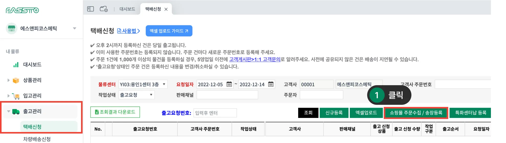 1. FMS ‘출고 관리 > 택배 신청’에서 ‘쇼핑몰 주문 수집 / 송장 등록’ 버튼을 클릭합니다.