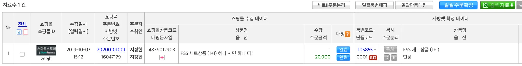 다시 [검색]하여 조회하시면 세트 상품 주문 건이 단일상품 주문 건으로 분리된 것을 확인하실 수 있습니다.