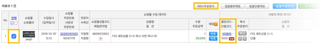 세트 상품 체크 후 [세트||주문분리]를 누르면 단일 상품 주문으로 분리됩니다.