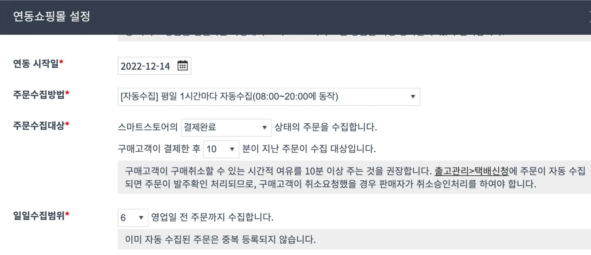 [쇼핑몰 연동] > [연동 쇼핑몰 관리]에서 쇼핑몰 연동시, 아래의 항목을 통해 자동 수집을 설정할 수 있습니다. 주문 수집은 30분 ~ 1시간 간격으로 진행됩니다.