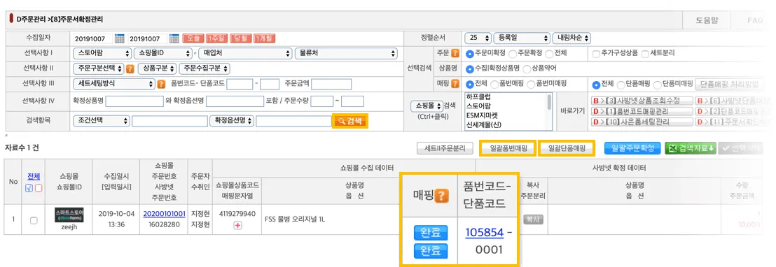 [일괄품번매핑]>[일괄품번매핑]을 누르면 주문과 상품의 매핑이 완료됩니다. 다시 [검색]하여 조회하시면로 보였던 ‘품번코드-단품코드’가 숫자로 변경된 것을 확인할 수 있습니다. 반드시 품번코드, 단품 코드 둘 다 매핑되어야 합니다.