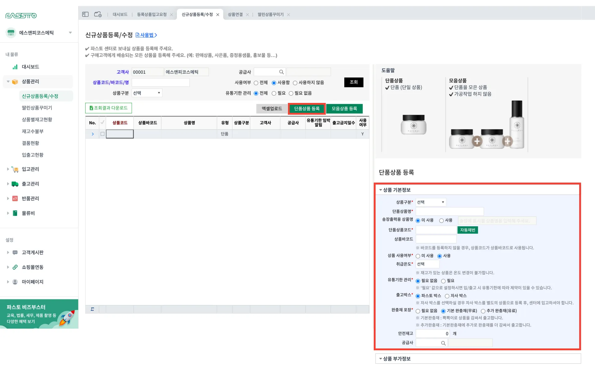 [상품관리] > [단품상품 등록], [모음상품 등록]