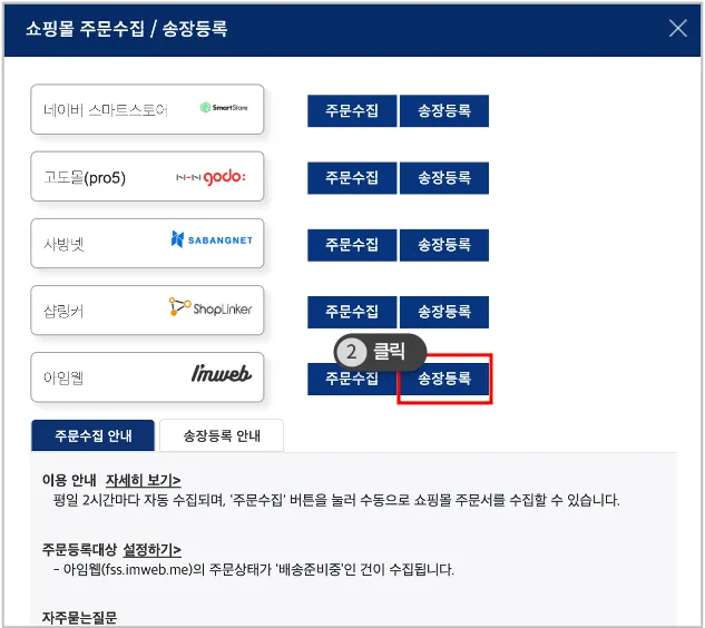 '송장등록' 버튼을 클릭하면 아임웹에 송장번호가 등록됩니다.