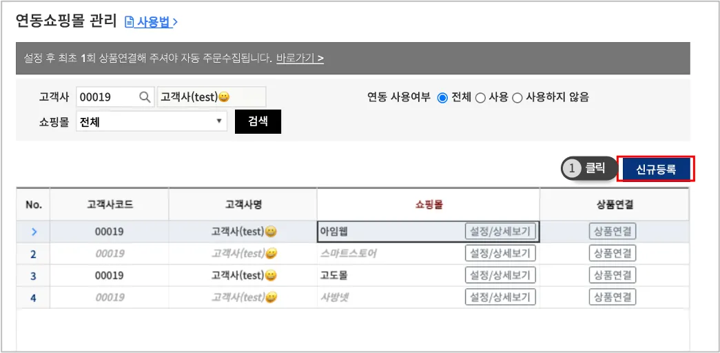 1. 파스토 FMS의 [쇼핑몰연동]> [연동쇼핑몰 관리] 메뉴에서 쇼핑몰을 등록해 주세요.