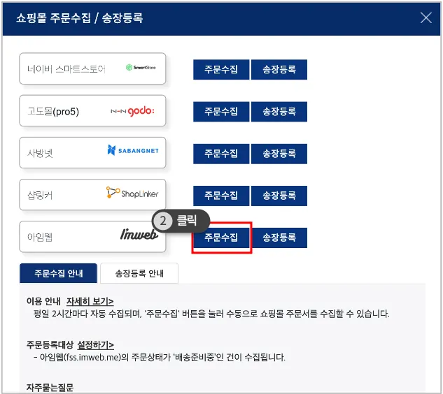 '주문수집' 버튼을 클릭하면 아임웹에서 판매된 주문 중 주문수집대상에 포함되는 주문이 수집됩니다.