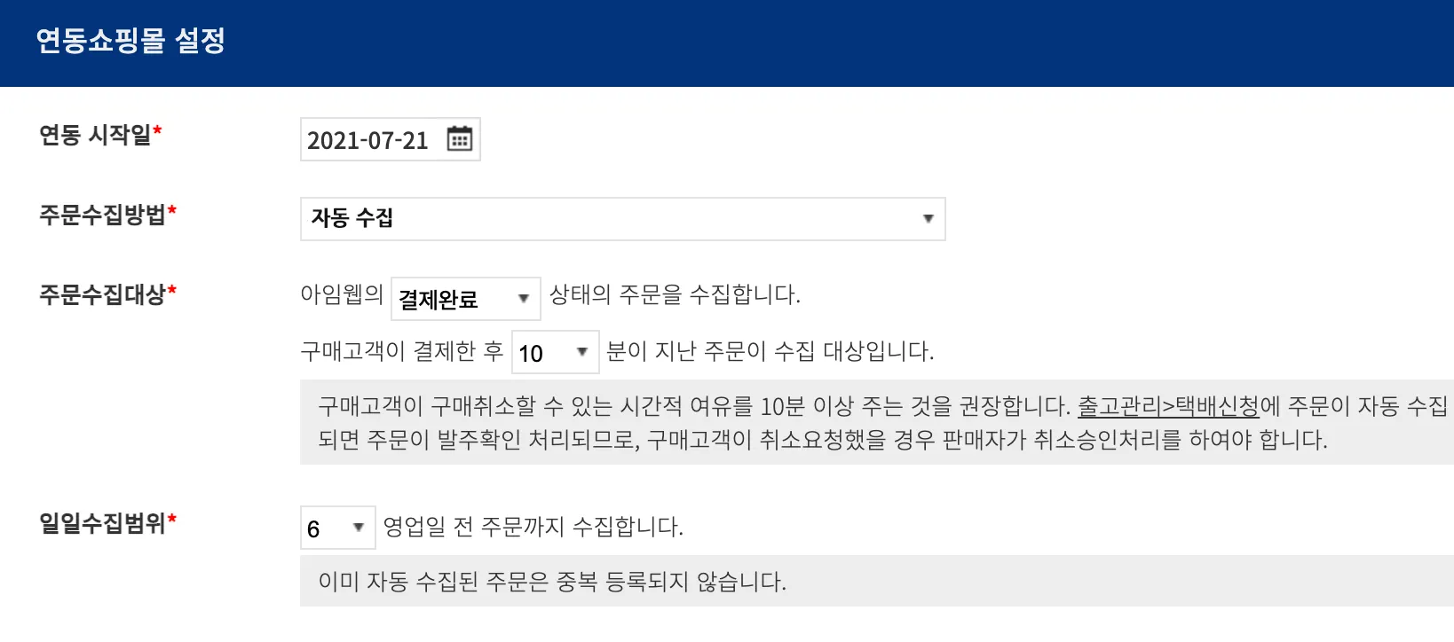 일일주문수집범위: 기본값은 ‘6일’입니다. 6일간 쇼핑몰에 모인 주문 건이 수집 대상이 됩니다.