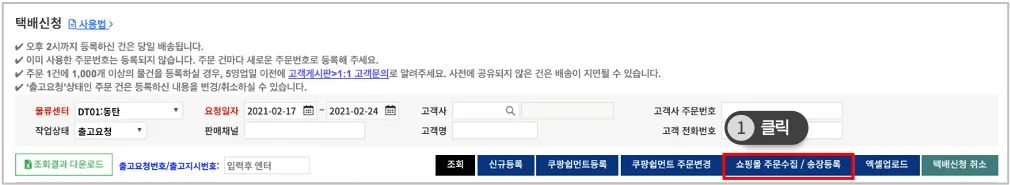 FMS [출고관리] > [택배신청]에서 ‘쇼핑몰 주문수집 / 송장등록’ 버튼을 클릭합니다.