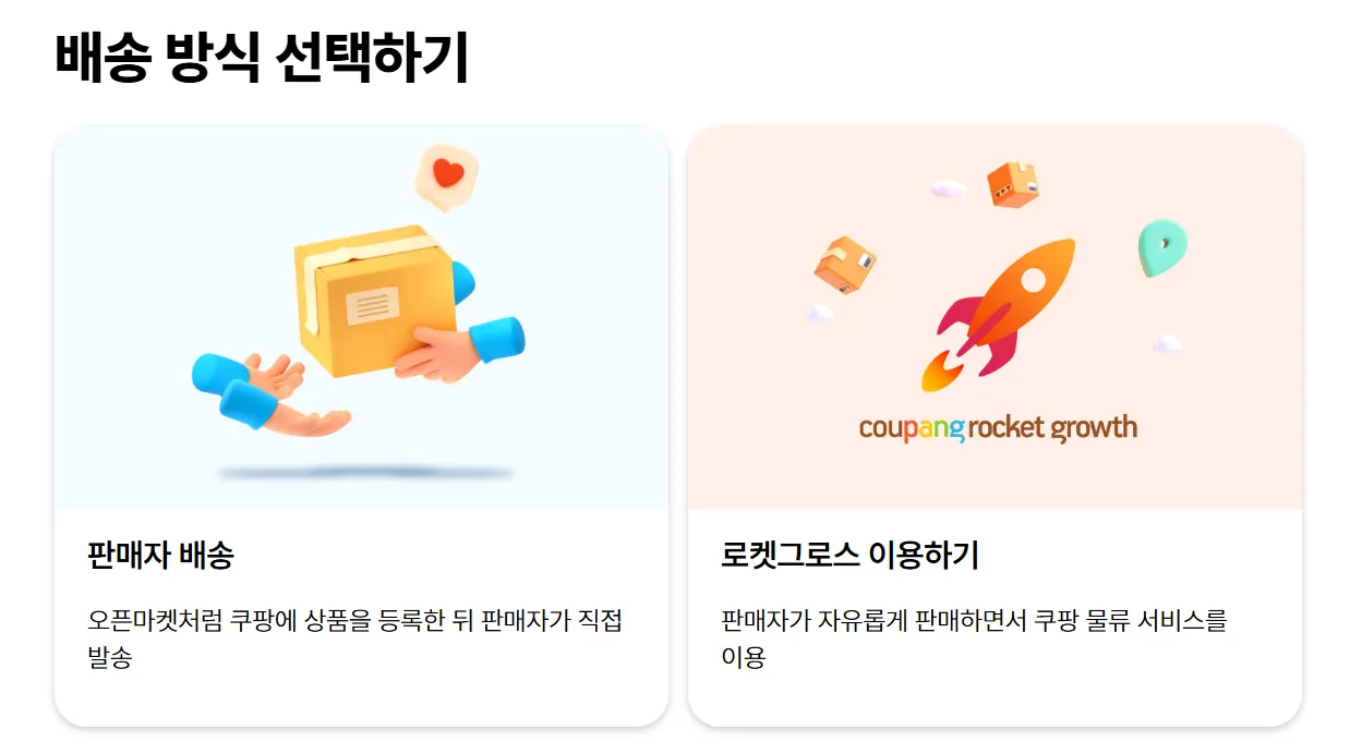 마켓플레이스 (판매자 직접 배송): 쿠팡에 상품을 등록만 하고, 주문이 들어오면 셀러가 직접 재고 관리, 포장, 배송까지 모두 처리하는 방식입니다.