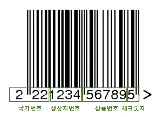 가장 많이 쓰이는 EAN-13 바코드의 경우 상품에 관계없이 국가 코드(3자리) + 생산지 번호(또는 판매자 번호) 4~6자리 + 상품번호 5~3자리 + 체크섬 1자리로 이루어져 있습니다.