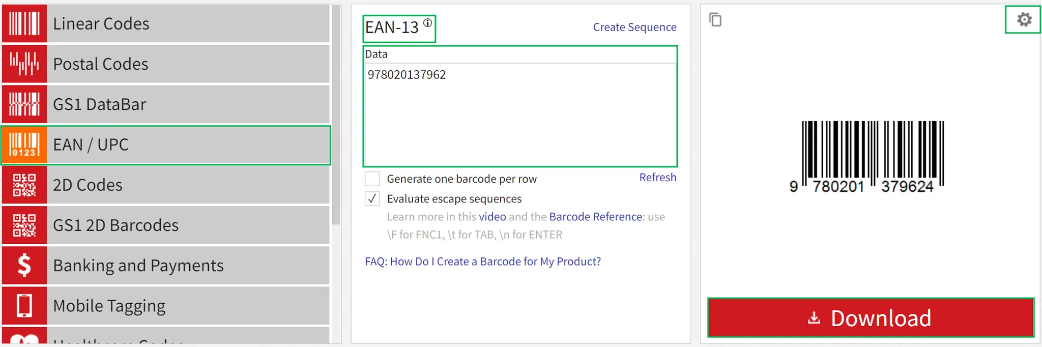 [EAN/UPC] 목록에서 ‘EAN-13’을 누르시고 Data 부분에 13자리 코드를 입력해 주시면 우측에 자동적으로 이미지가 생성되고, 다운로드가 가능합니다. 톱니바퀴(