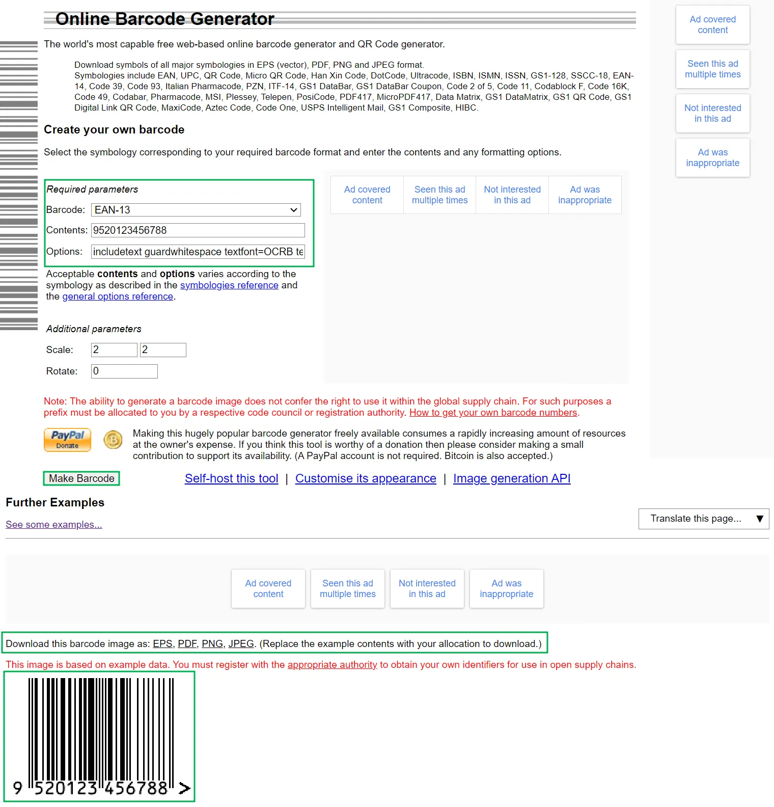 Required parameters 항목의 Barcode(EAN-13 선택), Contests(13자리 코드 입력), Options(바코드에 대한 설명 입력)를 입력한 뒤 하단의 [Make Barcod] 버튼을 클릭만 하면 이미지가 생성됩니다. 생성된 이미지는 epf, pdf, png, jpeg 형식으로 원하는 포맷 형식을 클릭하면 다운로드가 가능합니다.