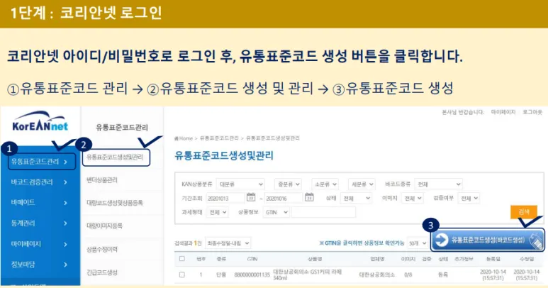 ③ 승인 후, 로그인을 하시면 [유통표준코드 생성] 버튼을 클릭하실 수 있습니다.